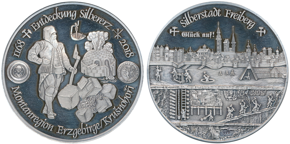 Das erste von den Numismatikern nach akribischer zweijähriger Vorarbeit vorgelegte Exemplar widmete sich 2018 dem Anlass „850 Jahre Entdeckung Silbererz in Freiberg“. „Dabei greifen wir gemäß der Sage das Geschehnis auf, dass einem Fuhrmann um 1168 bei einem Salztransport nach Böhmen während der Fahrt durch eine Furt des Loßnitzbaches hellglänzende Bleierzbrocken im Geschiebe aufgefallen sein sollen“, sagt Helmut Herholz, der die thematischen Grundlagen für die Medaillen erarbeitet. Die ersten 150 Exemplare in Kaiserzinn sowie einer edleren Ausgabe in Feinsilber waren sehr begehrt und weckten das Interesse einer großen Sammlerschar. „Diese erfreuliche Nachfrage ließ uns die Entscheidung treffen, die nachfolgende Motive in Größenordnungen von bis zu 500 Stück auflegen zu lassen.“ 2019 ließen die Freiberger das Thema des Bergbaus am Rothen Berg in Erla folgen. „In der Umgebung von Schwarzenberg waren diese Eisenerzlagerstätten für Sachsen von größter Bedeutung.“